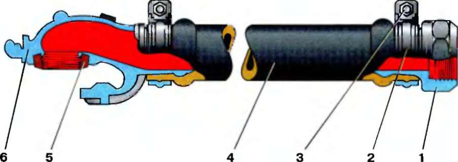 I — наконечник; 2 — хомут; 3 — болт хомута; 4 — резинотканевая трубка; 5 — уплотнительное кольцо; 6 — головка