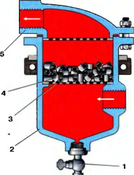 Он состоит из корпуса 4, фильтрующей набивки 3 из конского волоса и крышки 1. Набивку слегка промасливают и закладывают между сетчатыми шайбами 2.