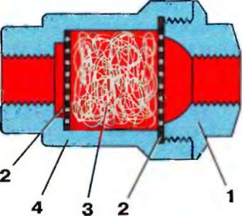 Рис. 5.42. Фильтр воздухопроводный усл. № Э-114: 1 - крышка; 2 — сетчатая шайба; 3 — набивка; 4 корпус