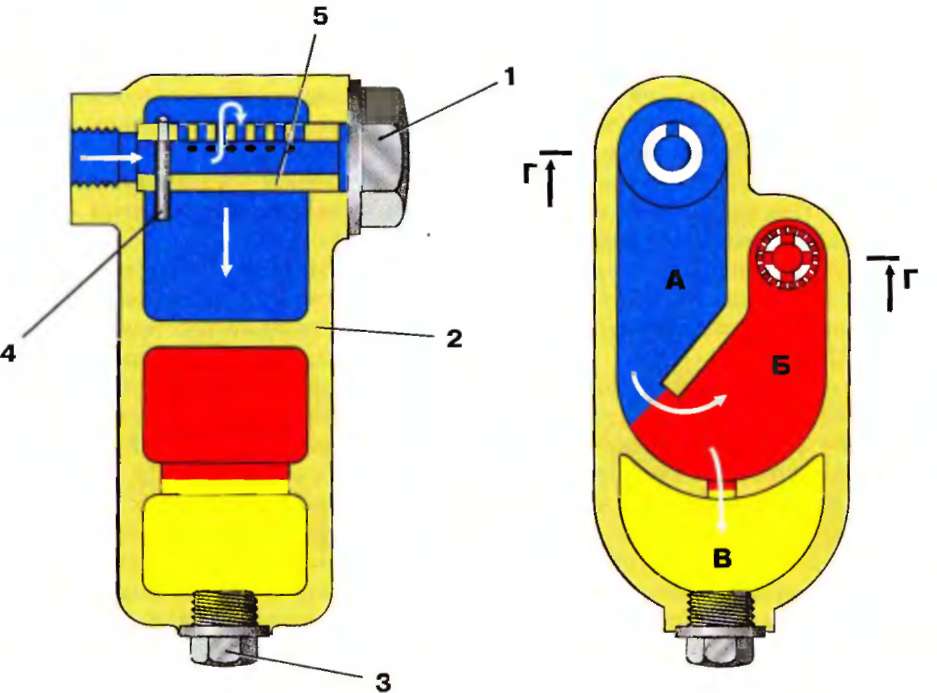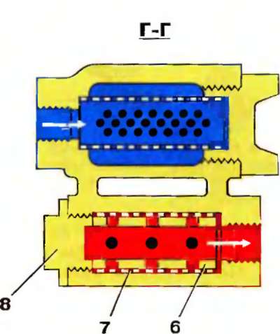 1, 3, 8 — пробка; 2 — корпус; 4 — шпилька; 5 — фильтрующий патрон; 6 — цилиндр; 7 — сетка