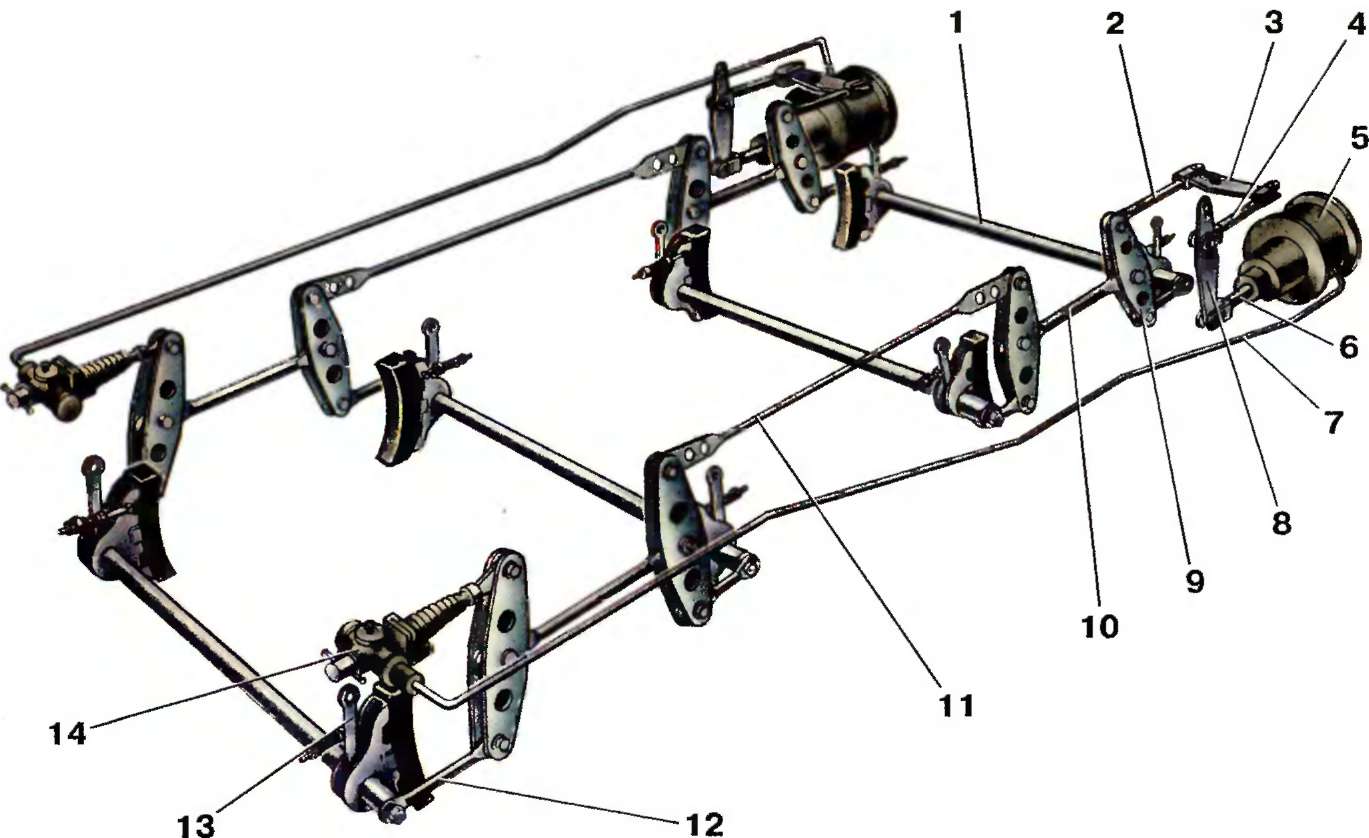 1 - траверса башмака; 2 - передняя тяга; 3 - рычаг; 4 - крайняя тяга; 5 - тормозной цилиндр; 6 - тормозная трубка; 7 - наклонный рычаг; 8 - вертикальный рычаг; 9 -затяжка; Ю - средняя тяга; 11 - тяга башмака; 12 - подвеска колодок; 13 - регулятор выхода штока