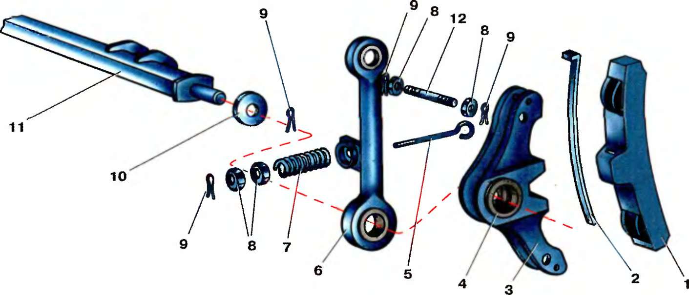 I - тормозная колодка; 2 - чека; 3 - башмак; 4 - втулка; 5 - поводок; 6 - подвеска башмака; 7 - пружина; 8 - гайка; 9 - шплинт; 10 - шайба; 11 - триангель; 12 - палец поводка