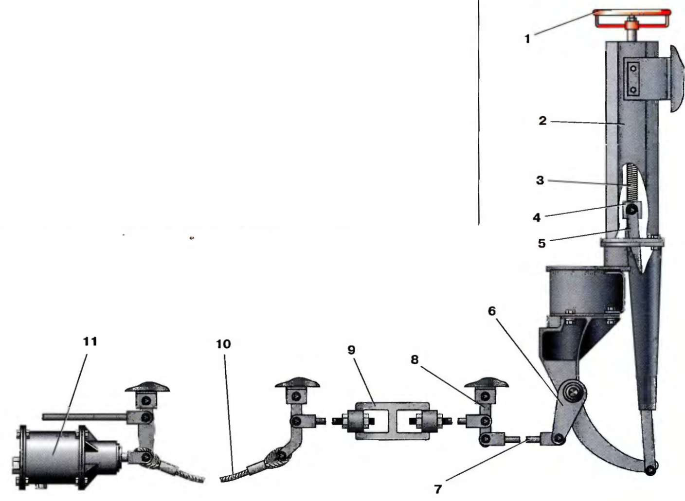 I — маховик; 2 — колонка; 3 — тормозной винт; 4 — гайка; 5, 8 — вертикальные тяги: 6 — коленчатый вал; 7 — горизонтальная тяга; 9 — регулировочный узел; 10 — трос;