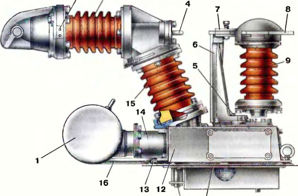 1 — резервуар; 2 — фланец; 3 — камера; 4 — неподвижный контакт; 5 — болт для присоединения заземляющей шины; 6 — заземляющий кронштейн; 7 — разъединитель; 8 — вывод для подключения к высоковольтной сети; 9 — поворотный изолятор разъединителя; 10 — резиновая прокладка; 11 — штуцер питающего воздуховода; 12 — корпус; 13 —штуцер отводящий трубы; 14 — патрубок; 15 — воздухопроводный изолятор