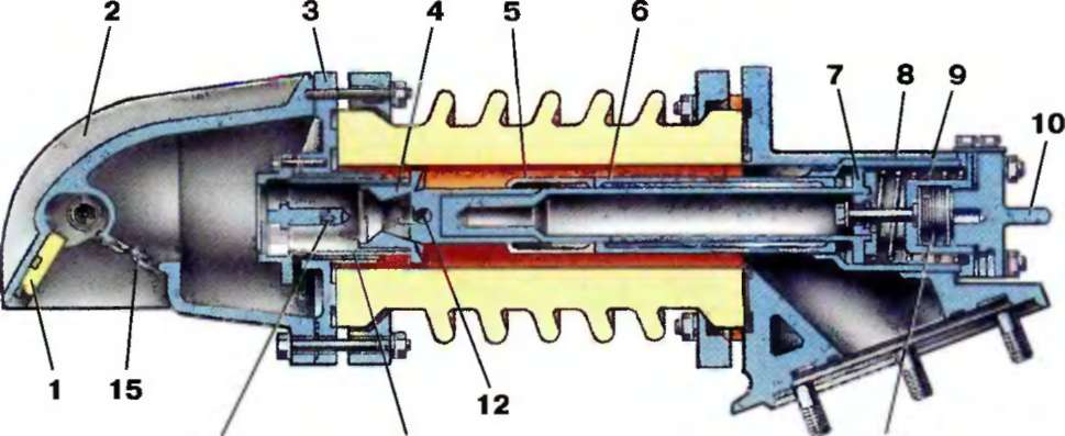 1 — демпфер; 2 — головка; 3 — фланец; 4 — дугогасительный контакт; 5 — гибкие ламели; 6 — трубка; 7 — поршень; 8 — цилиндр; 9 — пружина; 10 — неподвижный контакт; 11 — демпфер поршня; 12 — подвижный дугогасительный контакт; 13 — труба; 14 — ограничитель; 15 — выхлопной клапан