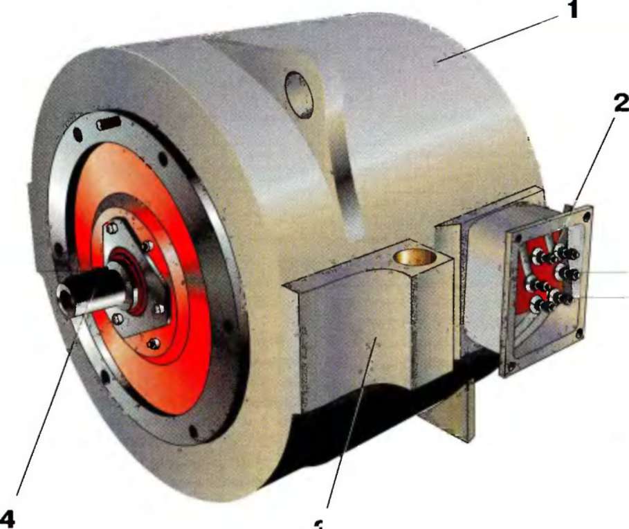 1 — корпус; 2 — коробка выводов; 3 — крон-\ штейн крепления; 4 — вал ротора