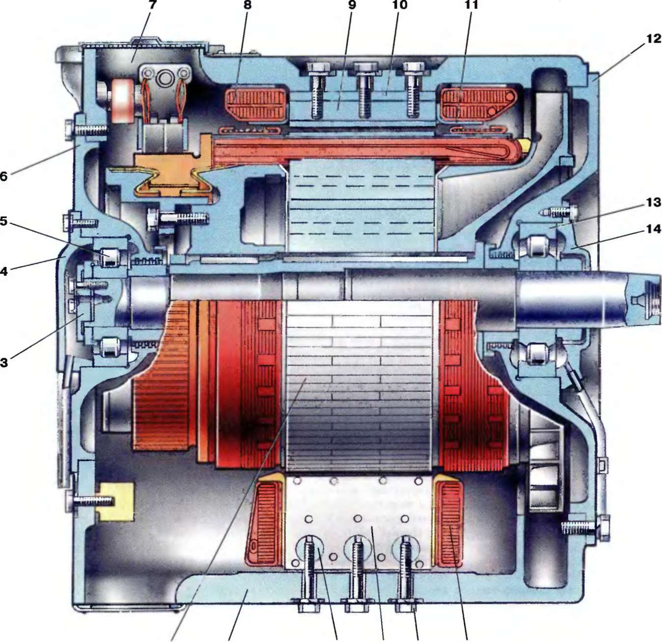 1 — остов двигателя; 2 — якорь; 3 — упорная шайба; 4 — передняя крышка; 5 — радиально-упорный подшипник; 6 — передний подшипниковый щит; 7 — щеткодержатель; 8 — катушка главного полюса; 9 — стержень главного полюса; 10 — сердечник главного полюса; 11 — пружинный фланец; 12 — задний подшипниковый щит; 13 — радиальный подшипник; 14 — задняя крышка; 15 — катушка дополнительного полюса; 16 — полюсный болт; 17 — сердечник дополнительного полюса; 18 — стержень дополнительного полюса