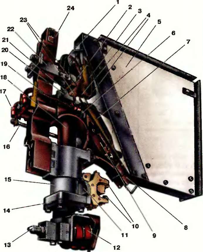 1 — плюсовой контакт; 2 — упорная планка дугогасительной камеры; 3 — верхний дугогасительный рог; 4 — дугогасительные контакты; 5 — дугогасительная камера; 6 — пружина; 7 — нижний дугогасительный рог; 8 — пружинный замок дугогасительной камеры: 9 — изоляционный кронштейн; 10 — блокировочные контакты; 11 — направляющая изолятора подвижного контакта; 12 — катушка вентиля; 13 — вентиль; 14 — крышка; 15 — цилиндр; 16 — стержень; 17 — внешний вывод; 18 — изолятор; 19 — соединительный провод; 20 — подвижный контактный держатель; 21 — ось; 22 — неподвижный контакт; 23 — главные контакты; 24 — изоляционная стойка