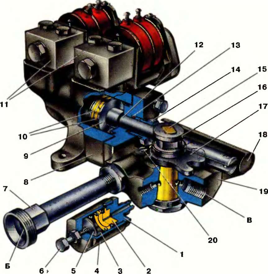 1 — седло клапана редуктора; 2 — клапан редуктора; 3 — пружина клапана редуктора; 4 — корпус редуктора; 5 — тарелка пружины; 6 — регулировочный болт; 7 — входной патрубок от резервуара; 8 — цилиндр; 9 — поршень: 10 — уплотнительные кольца поршня: 11 — включающие вентили; 12 — шток; 13 — уплотнитель-ная набивка; 14 — уплотнительная гайка штока; 15 — золотниковая пробка; 16 — головка золотниковой пробки; 17 — звезда; 18 — защитный кожух; 19, 27 — клапанная коробка; 20 — винт дросселирующего устройства; Б — отверстие подвода сжатого воздуха; В — вывод к пневмоцилиндру
