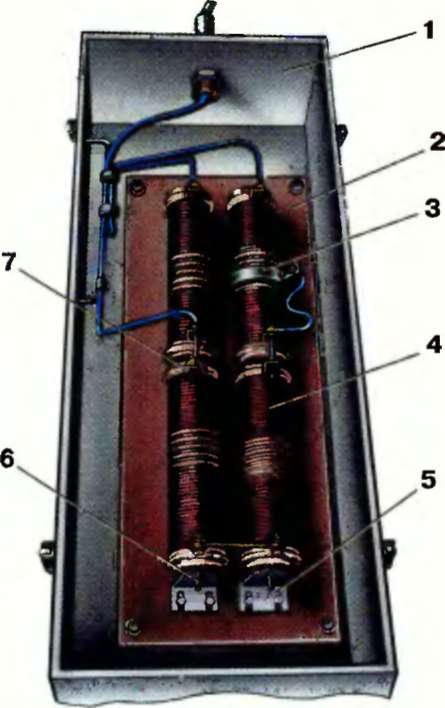 I — защитный кожух; 2 — панель; 3 — регулировочный хомут; 4 — резисторный элемент; 5 — держатель; 6 — шпилька; 7 — фиксирующая скоба