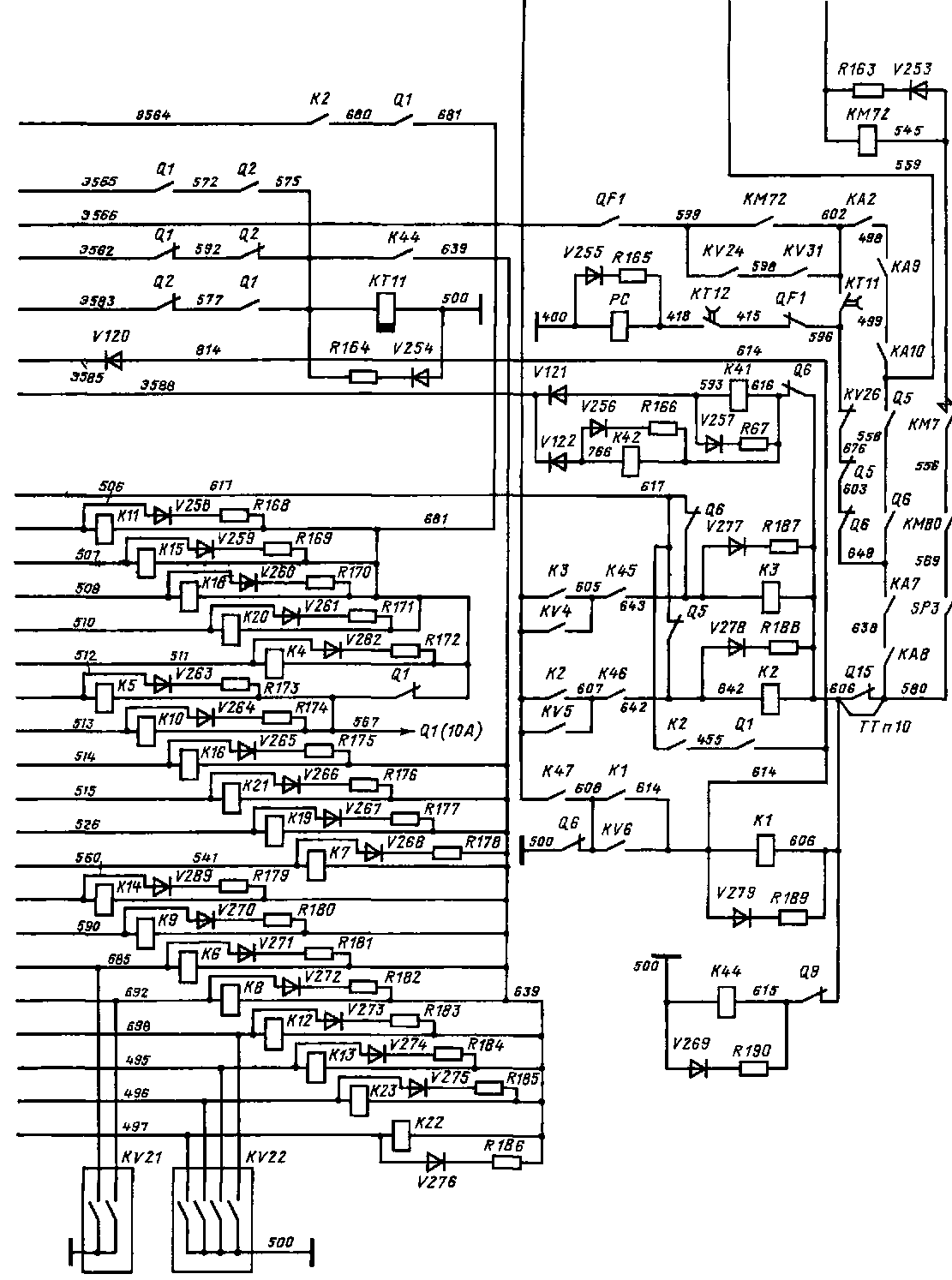 На соединении СП включаются контакторы КЗ и К5. При этом от провода Э564 по цепи: размыкающий контакт Q2, провод 591, замыкающий контакт линейных контакторов КЗ и К5 напряжение подается к катушкам реостатных контакторов К17, К18 и К12, К13. На соединении С включается линейный контактор К1 и через провода Э582, Э534, контакт Q5, размыкающий контакт группового переключателя Q1, провод 591, замыкающий контакт К1, провод 681 напряжение подается к катушкам реостатных контакторов К22, К23, а от провода 681 через размыкающие контакты Q1 по проводам 639, 680 — соответственно к катушкам реостатных контакторов Kt2, КІЗ и К17, К18.