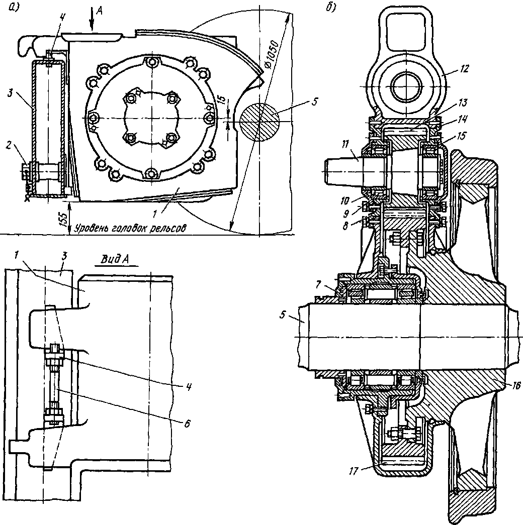 Рис. 34. Подвешивание тягового двигателя на раме тележки моторного вагона (а) и редуктор (б) моторных вагонов электропоездов ЭР2 я ЭР9Е
