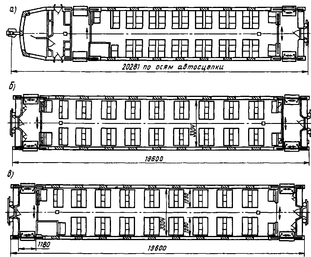 Рис 44 Планировка кузова головного (а), моторного (б) и прицепного (в) вагонов электропоезда ЭР2