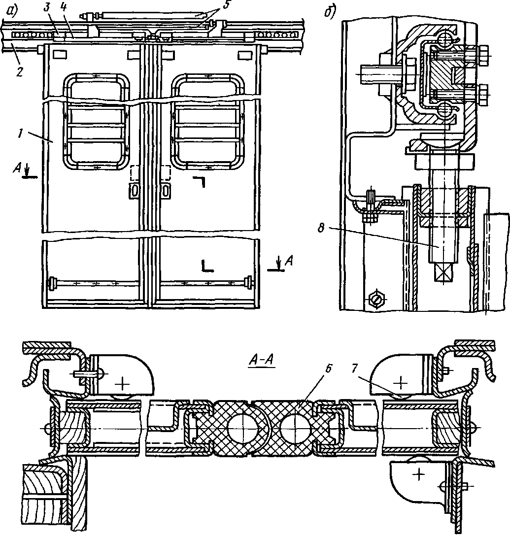 Рис 45. Наружные раздвижные двери (а) и узел подвески дверей (б) кузова вагона электропоезда