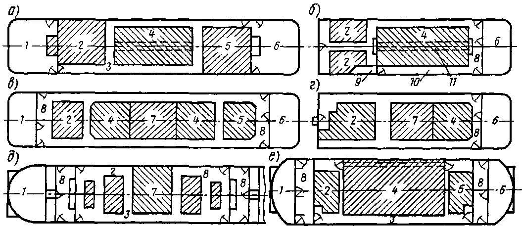 Рис. 54 Схемы расположения оборудования в кузовах электровозов ВЛ23 с двусторонним проходом (а), в секциях ВЛ10 и ВЛ10* (б), на электровозе ВЛ60" с симметричным проходом относительно поперечной оси (а), ВЛ80С (г), ЧС4 и ЧС4Т (д) и ЧС2Т (<?): / и б — кабины машиниста (посты управления), 2 и 5 — машинные помещения; 3 — проходы, 4 — высоковольтная камера; 7—трансформаторное помещение; 8—поперечный проход; 9 — форкамера; 10— тупиковый проход; //— глухой проход в высоковольтной камере
