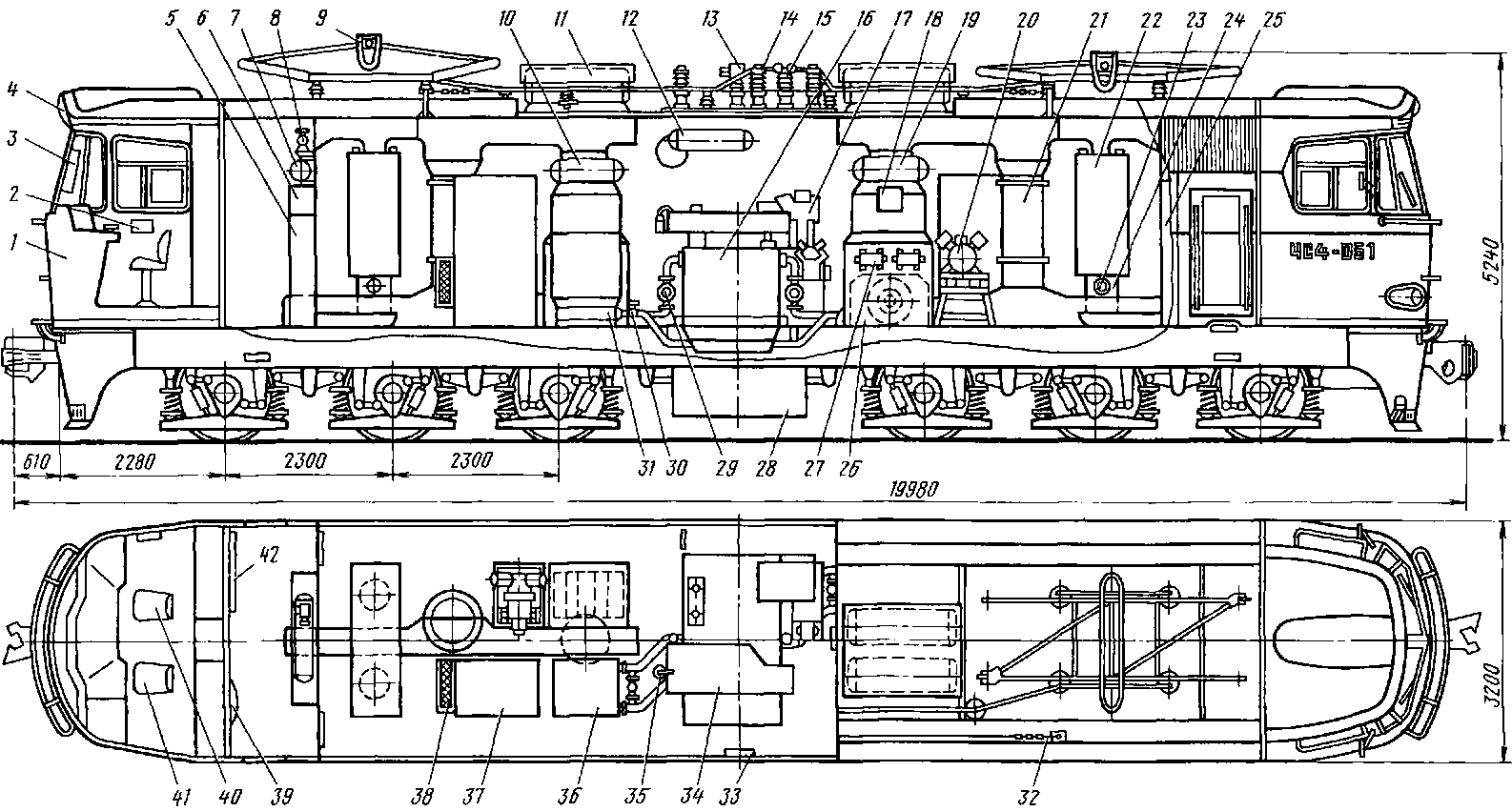 Рис 57. Расположение оборудования на электровозе ЧС4' / — пульт управления, 2 — маневровый контроллер, 3 — пятизначный светофор, 4 — прожектор, 5 — зарядное устройство, 6 — панель с пневматическими аппаратами; 7 — воздушный резервуар цепей управления; 8 — вспомогательный мотор компрессор, 9 — токоприемник; 10 — вспомогательный воздушный резервуар, //—.главный воздушный резервуар, 12— резервуар главного выключателя, 13 — главный выключатель, 14 — разрядник, 15 —- блок разъединителей токоприемников, 16 — тяговый трансформатор, 17 — переключатель ступеней, 18 — блоки емкостной защиты от перенапряжений во вспомогательных цепях; 19 — мотор вентилятор резисторов ОП, сглаживающих реакторов и маслоохладителей, 20 — мотор-компрессор; 21 — мотор-вентилятор тяговых двигателей, 22 — выпрямительная установка, 23 — воздухоструйиое реле, 24 — мотор вентилятор выпрямительной установки, 25 — шкаф с контакторами и реле, 26 и 27— сглаживающие реакторы тяговых и вспомогательных двигателей, 28 — аккумуляторная батарея; 29 — мотор-насос, 30 — запорный кран системы масляного охлаждения, 31 — радиаторы охлаждения; 32 — антенна радиостанции, 33 — коробка зажимов, 34 — расширительный бак, 35 — воздухоосушнтель, 36 — шкаф с резисторами ОП, 37 — шкаф с высоковольтной аппаратурой, 38 — блоки емкостной защиты от перенапряжений в тяговых цепях, 39 — бытовой холодильник, 40 — кресло машиниста; 41 — кресло помощника, 42 — шкаф с аппаратурой управления зарядным устройством