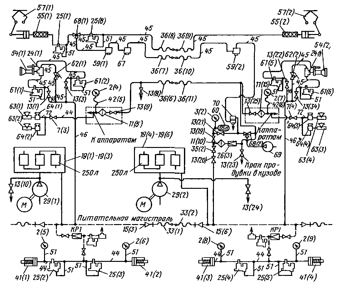 2(4)—2(9) — манометры, 7(3), 7(4) — краны разобщительные (уел № 4200), 11(5, 10, 15) — фильтры Э-114, 13(1, 3, 8, 9—21, 23, 25, 32, 34) — кран разобщительный (усл. X» 383); 19(1)—19(3). 19(4)— 19(6) — резервуары главные; 24(1)—24(8) — клапаны переключательные ЗПК; 25(2)—25(5), 25(7), 25(8) — клапаны КП-53-05, 26(3) — редуктор усл. Х9 348, 29(1), 29(2) — компрессоры КТ-бЭл; 35(2) — клапан обратный Э-175; 36(6)—36(11) — рукав, 41(1)—41(4) — цилиндры нагружающие 510 Б, 42(5), 42(6) — рукава, 44 — труба 13 X 2,5; 45 — труба 22 х 3,5; 46 — труба 27 X 3, 5; 51 — труба МЗ-10 X 1; 54(1), 54(2) — ревуны, 55(1), 55(2) — рукава изолирующие токоприемников 57(1), 57(2); 60 — резервуар токоприемника, 61(1, 2. 5, 6) — клапаи КП-39, 62(1), 62(2) — клапаны КС-52; 63(1)—63(4) —