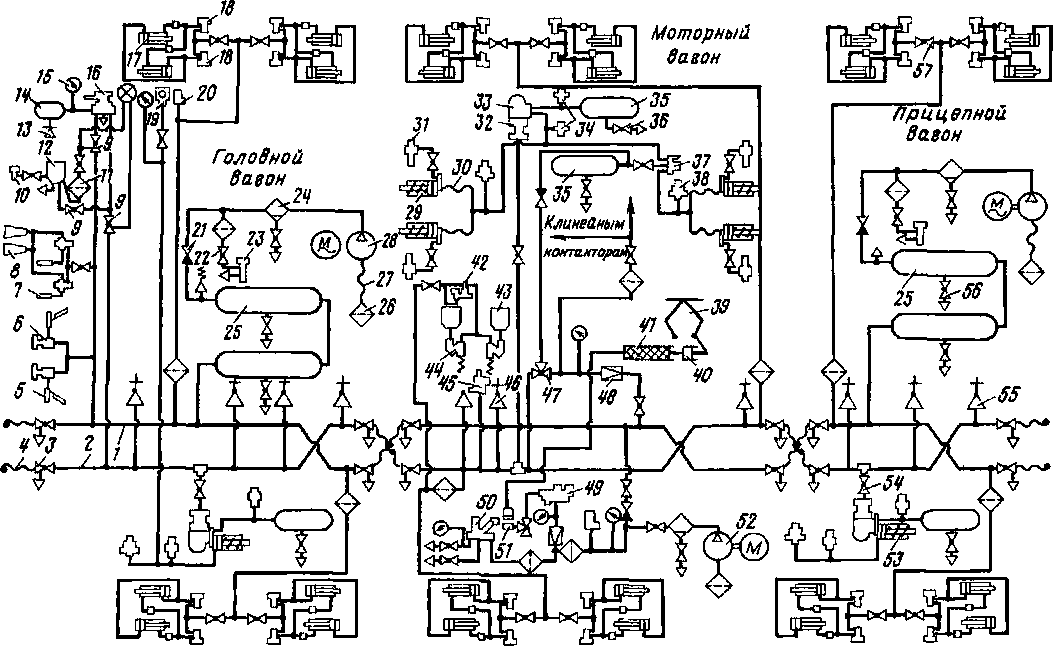 Схемы пневматических цепей вагонов электропоездов. На вагонах проложено два трубопровода для напорной / (рис. 66) и тормозной 2 магистралей, заканчивающиеся концевыми кранами 3 и соединительными рукавами 4. Для питания сжатым воздухом всей пневматической системы электропоезда на головных и прицепных вагонах установлены электрокомпрессоры. Электрокомпрессор 28 рукавом 27 соединен с фильтром 26, через который происходит всасывание воздуха из атмосферы. Нагнетание сжатого воздуха осуществляется по трубопроводу, соединяющему электрокомпрессор с главными резервуарами 25 вместимостью 170 л каждый Для выпуска конденсата применены краны 54.