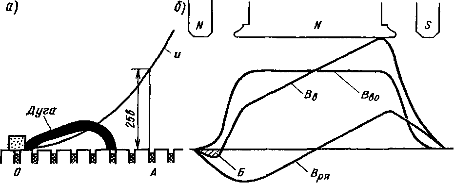 Возникновение потенциального искрения и кругового огня прежде всего связано с недопустимым повышением меж-ламельного напряжения. Искры, появившиеся под щеткой, образуют электрическую дугу (рис. 99, а), которая при вращении коллектора вытягивается и горит между неподвижными щетками и уходящими от иих коллекторными пластинами. Опытным путем установлено, что для горения дуги в тяговых машинах достаточно 22—25 В. Следовательно, если дуга, возникшая под щетками, растянется до точки А, то она не погаснет, а будет гореть между коллекторными пластинами, так как иапряжейие относительно точки 0 по кривой и межсегментного напряжения равно 25 В. При вращении якоря пластины коллектора непрерывно перемещаются. На место ушедшей пары пластин в точку А попадает новая пара и т. д. И в каждом случае будет гореть дуга. Из этих небольших дуг иад частью коллектора образуется круговой огонь.
