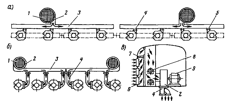 Рис. 100 Схемы вентиляции тяговых двигателей иа электровозах ВЛ8 (а), ВЛ23 (б),