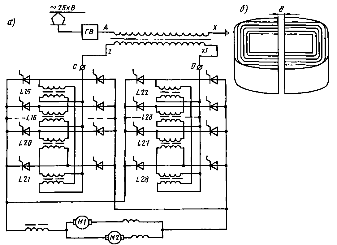 Выравнивание токов в параллельных ветвях индуктивными делителями L15 — L28 основано на взаимодействии м.д.с. обмоток, включенных встречно и индуктивно связанных. При этом нарастание тока, например, в обмотке делителя L15 вызывает в замкнутом магнитопроводе делителя значительный нарастающий магнитный поток, который приводит к резкому повышению разности потенциалов между анодом и катодом тиристора второй ветви и его открытие. В случае дальнейшего увеличения тока делитель обеспечивает его равномерное распределение между параллельно включенными тиристорами.