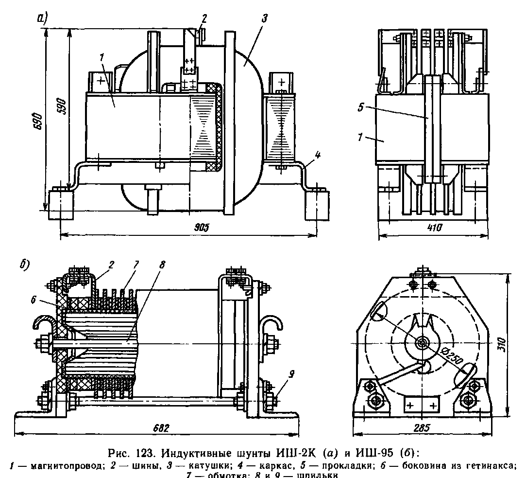 но-шихтованным сердечником (шунты ИШ-95 электровозов ВЛ80\ ВЛ80С и др., конструкция которых подобна конструкции сглаживающего реактора РС-53, см. рис. 119,а). Воздушные зазоры в стержнях обеспечивают малое изменение индуктивности шунта в диапазоне рабочих нагрузок тяговых двигателей, наличие этих зазоров позволяет устанавливать требуемую характеристику.