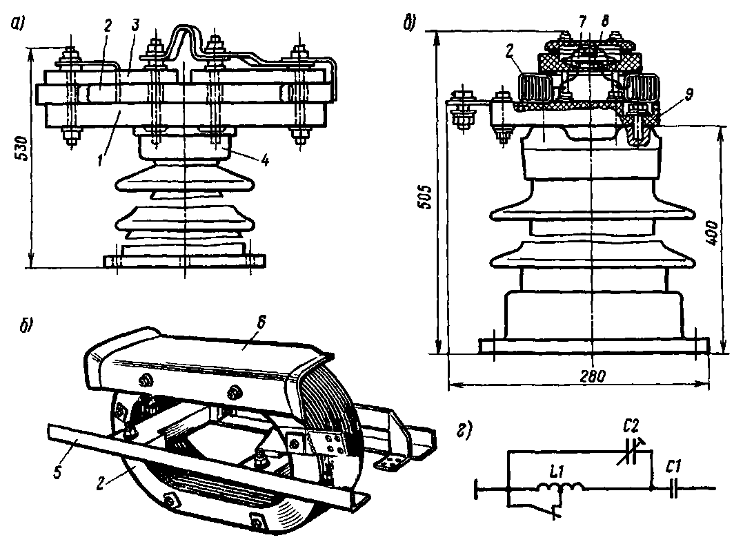 Реакторы, фильтры и конденсаторы помехоподавления. Они служат для снижения уровня радиопомех, создаваемых при работе электровозов и электропоездов. Реактор включают на э. п. с. постоянного тока последовательно в цепь между токоприемником и быстродействующим выключателем. За реактором со стороны силовой цепи подключают конденсатор (рис. 124, б), через который высшие гармоники тягового тока замыкаются на корпус (землю), не проникая в контактную сеть и не создавая помех радиоприему. Конденсатор также снижает крутизну фронта волны атмосферного перенапряжения и, следовательно, межвитко-вое напряжение в обмотках электрических машин.