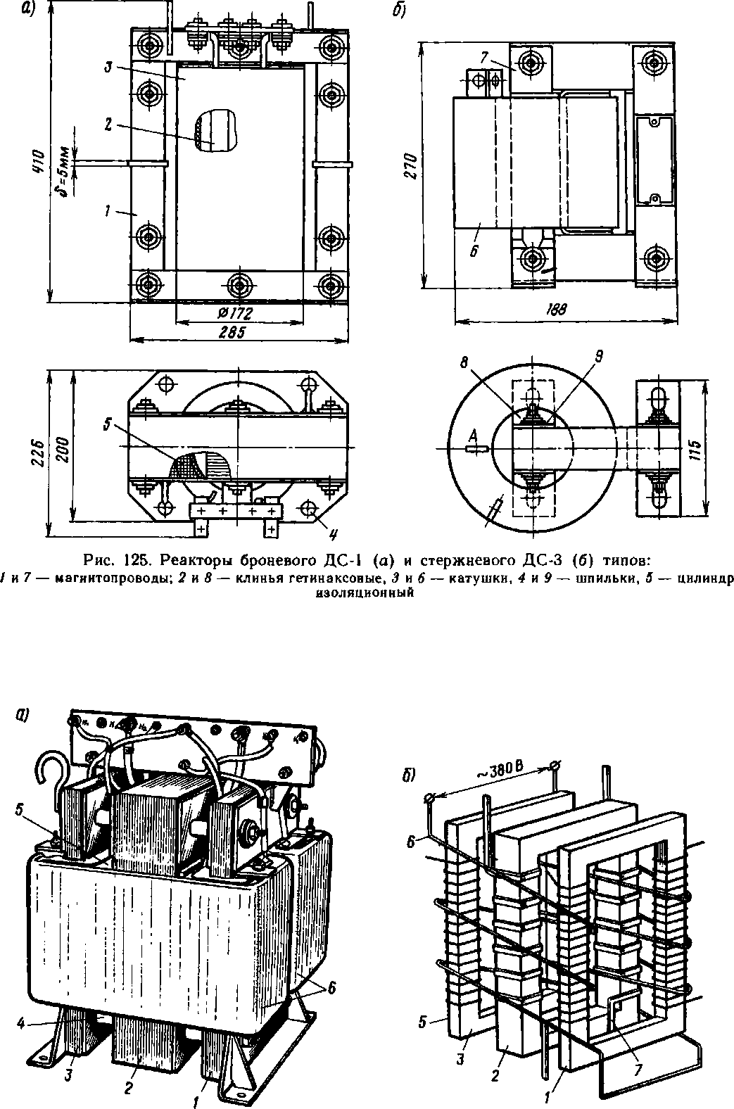 Д-111 на электропоездах ЭРЭП, ЭР22, ЭР22М и др.), защиты от замыкания на землю (ДЗ-1 на электровозах ВЛ80* и др.), как элементы индуктивно-емкостных резонансных контуров (Д-110, 1ДР-001 на электропоездах ЭРЭП, ЭР22, ЭР22М и др.) и в других цепях. Магнитную систему этих реакторов броневого (ДС-1, 1ДР-001 и др., рис. 125, а) или стержневого (ДС-3, ДЗ-1, Д-110 и др., рис. 125, б) типа набирают из лакированных пластин электротехнической стали (Э22, Э330 и др.) толщиной 0,35 или 0,5 мм.