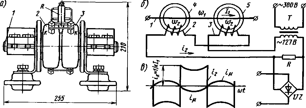 вода диаметром 0,55 мм с эмалевой изоляцией) и соединены последовательно и встречно, чтобы по возможности исключить влияние магнитных потоков рассеяния, которые могли бы нарушить пропорциональность токов Л и 12. При отсутствии тока в обмотке 1 обмотки 2 и 3 имеют большое индуктивное сопротивление и малый намагничивающий ток г,, (рис. 127, в). При увеличении тока в обмотке / (см. рис. 127, а, б и в) сердечники 4 и 5 подмагничиваются, индуктивное сопротивление обмоток 2 и 3 уменьшается и в их цепи возникает ток /г практически прямоугольной формы. Он меньше тока Л в отношении, равном коэффициенту к = Дог/мм.