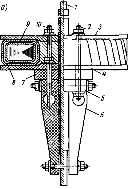 Некоторые конструктивные особенности имеют трансформаторы тока ТК-20, ТК-40 для питания токовых обмоток счетчиков электроэнергии отечественных электровозов переменного тока. Первичная обмотка трансформатора (рис. 128) выполнена в виде шины 1, проходящей через тороидальный шихтованный сердечник 9 и изоляционную стойку 6 с накладкой 5. Катушка 8, являющаяся вторичной обмоткой, и сердечник 9 удерживаются дисками 3 и 4, которые стянуты шпильками 2 и 10 и планкой 7. На трансформаторе ТК-40 сердечник с катушкой укреплен на стальном фланце.