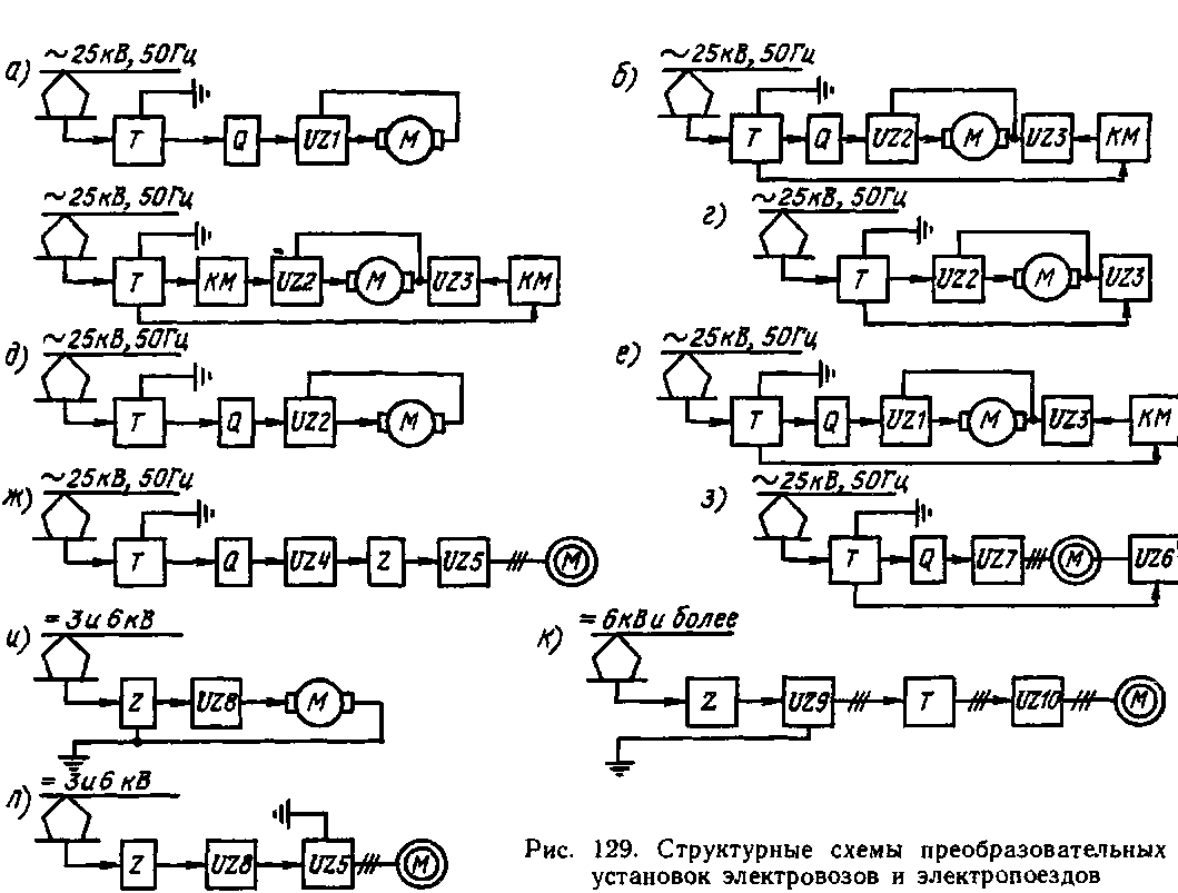На электровозе или электропоезде с диодным выпрямителем (рис. 129, а) напряжение, подаваемое через токоприемник трансформатором Т с групповым переключателем <3, понижается ступенями, выпрямителем 1Л1 преобразуется в постоянное и подается на тяговый двигатель М. Такую структурную схему имеют отечественные электровозы ВЛ60К; ВЛ80К и электропоезда ЭР9, ЭР9П и др.