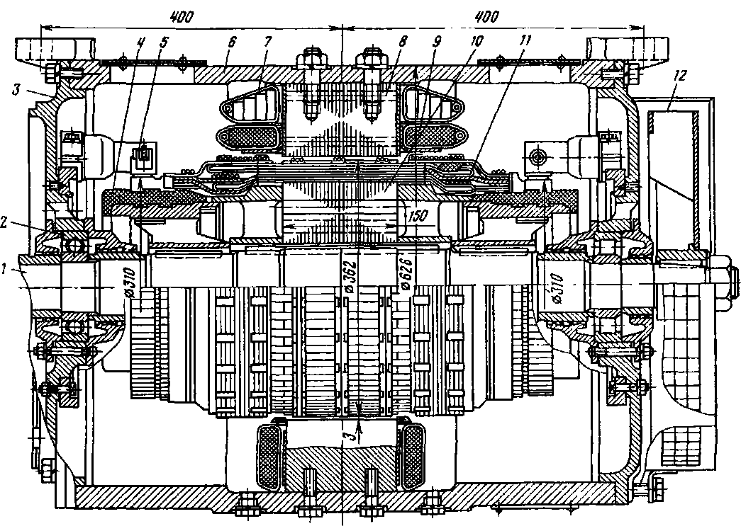 Рис. 148. Продольный разрез делителя напряжения ДК-604В-/ — вал, 2 — шариковый подшипник; 3 — остов генератора управления, 4 — коллектор с пластмассовым корпусом; 5 — щеткодержатель, 6 — остов делителя напряжения, 7 — обмотка последовательного воз буждеиия главного полюса, 8 — сердечник главного полюса, 9 — обмотка независимого возбуждения; 10 — сердечник якоря, 11 — обмотка якоря, 12 — вентилятор