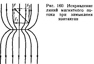 В момент замыкания и после замыкания в линейных и точечных контактах происходит искривление линий тока в материале контактов вследствие появления внутри угла изгиба магнитных потоков одного направления. Это вызывает электродинамические усилия /•" (рис. 160), стремящиеся выпрямить линию тока; слагающая этой силы вдоль оси контакта отталкивает контакты друг от друга, что при недостаточном начальном нажатии может вызвать отжатие и даже отрыв контакта, а следовательно, появление электрической дуги.
