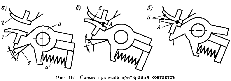 При отключенном контакторе держатель 3 (рис. 161, а) вместе с контактом 1 под действием притирающей пружины 4 повернут на некоторый угол а, который не изменяется до тех пор, пока подвижной контакт 1 не соприкоснется с неподвижным 2 (рис. 161, б). После этого начинается притирание. Рычаг подвижного контакта под действием привода продолжает двигаться вверх и заставляет держатель 3 поворачиваться на своей оси. Подвижной контакт / в это время накатывается на неподвижный 2, и происходит притирание до тех пор, пока держатель 3 не упрется в рычаг 5 (рис. 161, в) и движение рычага вверх не прекратится. Во время притирания контактов происходит не только накатывание одного контакта на другой от точки Б к точке А, но и скольжение одного контакта по поверхности другого; вследствие этого стирается пыль и сдираются слои окисла, которые могут образоваться на контактных поверхностях и увеличить переходное сопротивление.