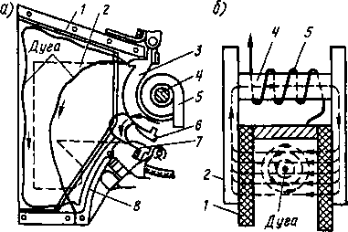 Рис. 162. Дугогасительное устройство (а) и схема, поясняющая взаимодействие магнитного потока дугогасительной катушки и дуги (б)