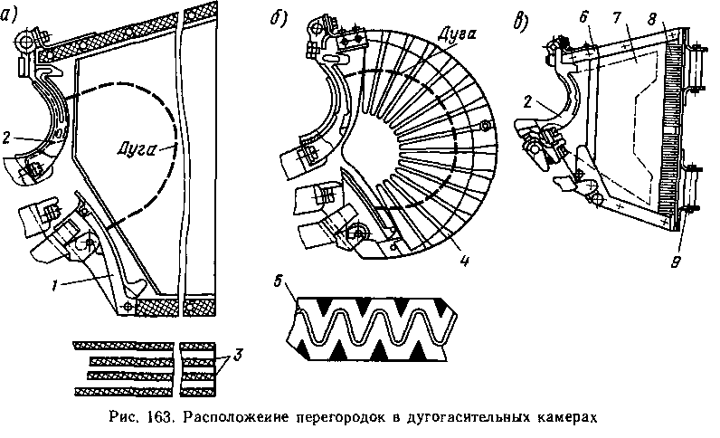 Продольные 3 и поперечные (см. рис.163, а, б и в) перегородки расщепляют дугу на несколько параллельных пучков, которые, проникая в щели и соприкасаясь с холодными перегородками, охлаждаются и деионизируются. Другое назначение перегородок — увеличение длины дуги при данных размерах камеры. При электромагнитном гашении дуги все же нельзя принимать произвольно малый раствор контактов, так как возможно повторное зажигание дуги.