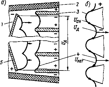 Деионные решетки увеличивают падение напряжения в дуге, не удлиняя ее. Их набирают из металлических изолированных одна от другой пластинок 3 (рис.164, а), расположенных в дугогасительной камере 2 поперек оси дуги 4. Дуга, перемещаясь, с рогов / и 5, делится решеткой на большое число последовательных дуг, каждая из которых имеет свое околоэлектронное падение напряжения В результате этого общее падение напряжения в дуге иа — (£/кат + + иая) — (рис. 164, б) резко увеличивается (здесь п — число решеток). Взаимодействие магнитного поля дуги с магнитными полями, образуемыми токами в перегородках, создает дополнительные силы, перемещающие дугу внутрь решетки.