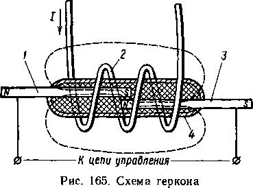 Поэтому очень большое значение имеет повышение механической и электрической износостойкости. Конструктивное выполнение контакторов разнообразно и в основном определяется током длительной нагрузки, максимальным током и максимальной допустимой температурой нагрева в пределах заданных габаритов, конструкцией дугогасительного устройства и системой привода. Чтобы повысить износостойкость контактов и уменьшить время замыкания и размыкания их на электровозах и электропоездах, в цепях управления начали применять герметичные контакты — герконы. Они выполнены в виде пластин / и 3 (рис. 165) из железоникелевого сплава и размещены в баллоне 4 (стеклянный или из другого материала), заполненном азотом с примесью водорода или гелия при давлении от 1 ■ 105 до 4 • 105 Па (на групповых контакторах— контроллере 1КСП-009, где контакты расположены вместе с постоянными магнитами).