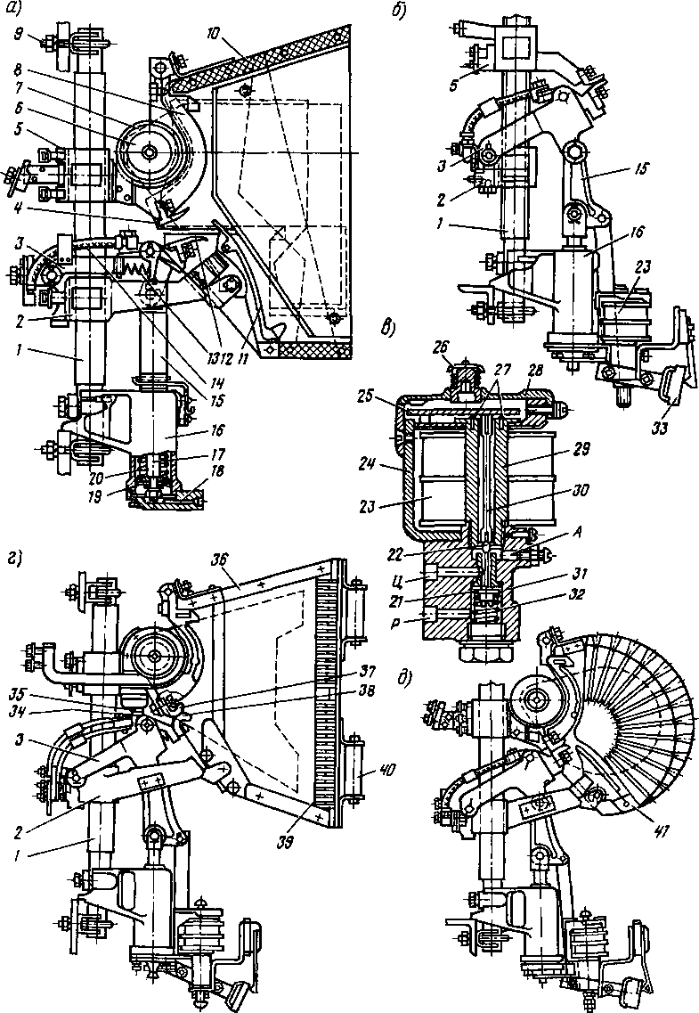 Рис. 166 Электропневмэтические индивидуальные контакторы с трехщелевой дугогасительной камерой ПК-41, ПК-46 (а), вентилем открытого исполнения (в), контакторы без дугогасительного устройства ПК-14 (б), с одиощелевой дугогасительной камерой, деиоиными решетками ПК-63, ПК-96— ПК-101 (г) и с лабиринтно-щелевой дугогасительной камерой ПК-21 — ПК-26 (д)