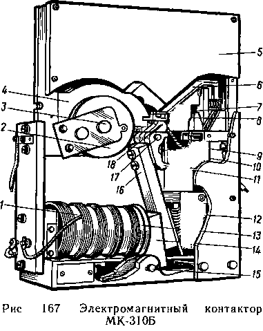 Контакторы МК-310А и МК-310Б на отечественном э.п с. применяют для замыкания и размыкания цепей вспомогательных машин и печей отопления Контактор МК-310Б (рис. 167) имеет узкощелевую камеру 5, дуга в которой выдувается вверх, чем ускоряется ее гашение при малых токах. Контакты 7 и 8 расположены вертикально.