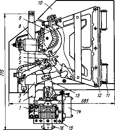 1 — катушка, 2 — изолированный стержень; 3 и 8 — соответственно нижний н верхний кронштейны; 4 — рычаг; 5 — контактная пружина; 5 и 7 — соответственно подвижной и неподвижный контакты, 9— дугогасительная катушка, 10— изолирующая перегородка; 11 — резистор, шунтирующий силовые контакты, 12 — дугогасительная камера, 13 — изоляционная тяга, 14 — блокировка мостикового типа; 15 — магнитопровод; 16 — якорь