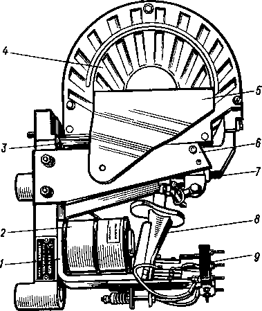 Выводы включающей катушки 1 присоединены к зажимам, расположенным на внешней стороне вертикальной планки. На якоре 14 укреплен текстолитовый рычаг 16 с кронштейном 11, на котором установлен подвижной контакт 8. Для предотвращения залипання якоря к сердечнику ось 15 вставлена в латунную втулку.