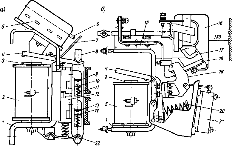 Рис. 170. Электромагнитные контакторы двухполюсного исполнения МК-63 (а) и МК-84— МК-86 (б): 1 — магнитопровод; 2— катушка; 3— сердечник; 4—якорь, 5, 21 — прозрачные кожуха блокировки, 6— шток блокировки, 7 — хвостовик якоря; 8 — траверса, 9, 13 и 17—неподвижные контакты, 10, 14 к 18 — подвижные контакты, 11 — контактная пружина; 12 — изоляционная панель из дугостойкого материала К-78; 15 — изоляционная колодка; 16 — дугогасительная камера из дугостойкого материала КМК-218, 19 — кронштейн подвижного контакта; 20 — выключающая пружина, 22 — коромысло ЭР2Р, ЭР22 для включения н отключения цепей вспомогательных машин с номинальным напряжением 3000 В. Контактор КМВ-104 (рис. 169) вместо дугогасительной катушки в системе дугогашения имеет постоянный магинт с двумя скрепленными заклепкой полюсами 5, которые создают магнитный поток постоянного направления. Поэтому требуется соблюдать полярность, присоединяя провода. При неправильном присоединении их дуга будет отклоняться не в дугогасительную камеру 4, а на токоведущие части. Номинальный ток контактора 100 А.