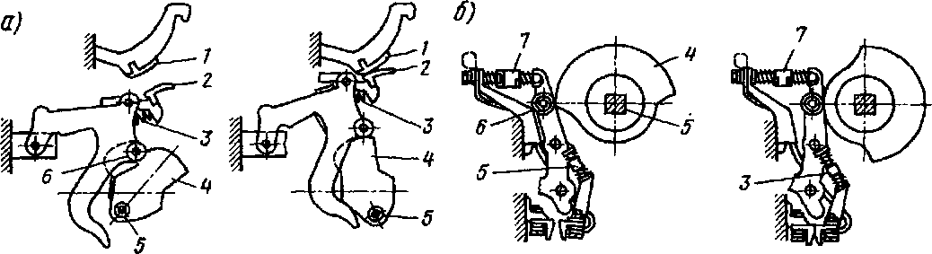 Рис. 171 Кинематические схемы кулачковых контакторов, работающих на замыкание (а) и размыкание (б):