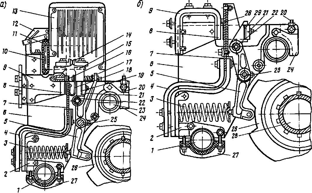 1 и 23 — рейки изолированные для установки контакторов, 2 — держатель; 3 — включающая пружина, 4 — гибкий шунт, 5 — приводной рычаг, 6 — боковина, 7 — контактный рычаг, 8 — якорь компенсатора; 9 — контактодержатель; 10 — полюс, // — фланец полюса, 12 — дугогасительная катушка с деионной решеткой, 13 — дугогасительная камера, 14— разрывные контакты, 15— рцчаг разрывного контакта; 16 — главные контакты; 17 — пружина разрывного контакта, 18 — гибкий шунт, 19 — регулировочные прокладки, 20 — прижимной винт, 21 — ярмо компенсатора, 22 — резиновая втулка, 24 — прижим; 25—центральная ось; 26—кулачковая шайба; 27 — хомут, 28 — кулачковый вал, 29 — прокладка
