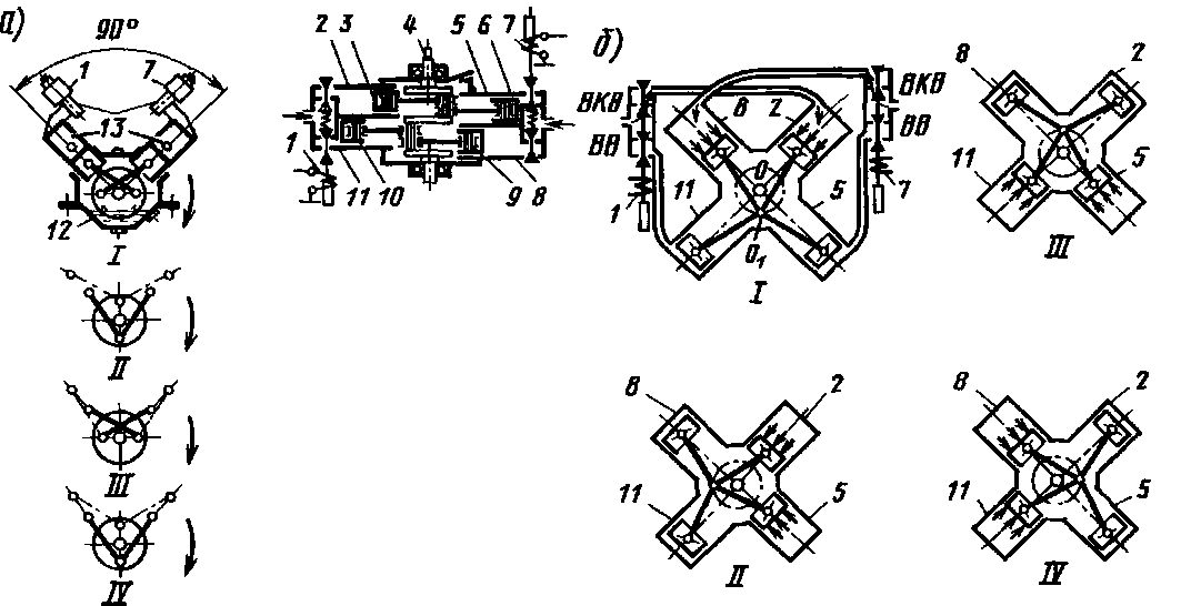 На нулевой позиции катушки вентилей / и 7 не возбуждены, сжатый воздух через выключающие клапаны поступает в цилиндры 2 и 8; цилиндры 5 и 11 сообщаются с атмосферой. Коленчатый вал 4 находится в положении /. При возбуждении катушки вентиля 7 цилиндр 8 сообщается с атмосферой, в цилиндр 5 поступает сжатый воздух. Коленчатый вал 4 поворачивается иа 90°, занимая положение //. Вал в этом положении фиксируется противодавлением поршня цилиндра 5. При дополнительном возбуждении катушки вентиля 1 цилиндр 2 сообщается с атмосферой, а в цилиндр // поступает сжатый воздух. Коленчатый вал 4 поворачивается снова на 90°, занимая положение ///, в котором и фиксируется противодавлением поршня цилиндра 11. Если разомкнуть цепь катушки вентиля 7, цилиндр 5 сообщится с атмосферой, а в цилиндр 8 поступит сжатый воздух. Коленчатый вал 4 займет положение IV, в котором и будет фиксирован противодавлением поршня цилиндра //. При дальнейшем управлении вентилями / и 7 положения коленчатого вала 4 повторяются, кулачковый вал переходит с одной позиции на другую.