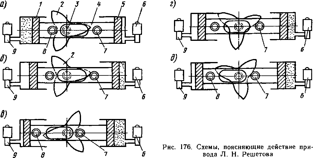 7 не упрется во впадину звезды 2, фиксируя ее. Это соответствует полному ходу штока внутри цилиндра от правого крайнего положения к левому, причем ролик 8 (см. рис. 176, о) установится несколько выше вершины третьего выступа звезды Если при этом кулачковый вал стремится повернуться дальше, т. е. проскочить соответствующую позицию, то нажатие ролика 7 на впадину звезды противодействует этому и вал остановится только в определенном положении.