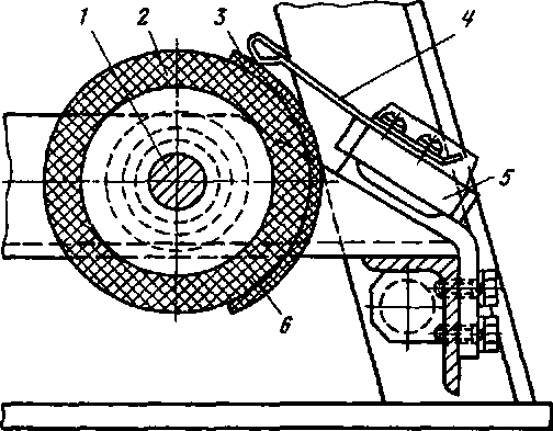 Рис. 178. Блокировочное устройство группового переключателя ПКГ-6 электровозов ВЛ10, ВЛ10* и ВЛ8: / — стальной вал, 2 — блокировочный барабан; 3 — медные сегменты; 4 — блокировочные пальцы; 5 — изоляционная рейка, 6 — изоляционная пластина