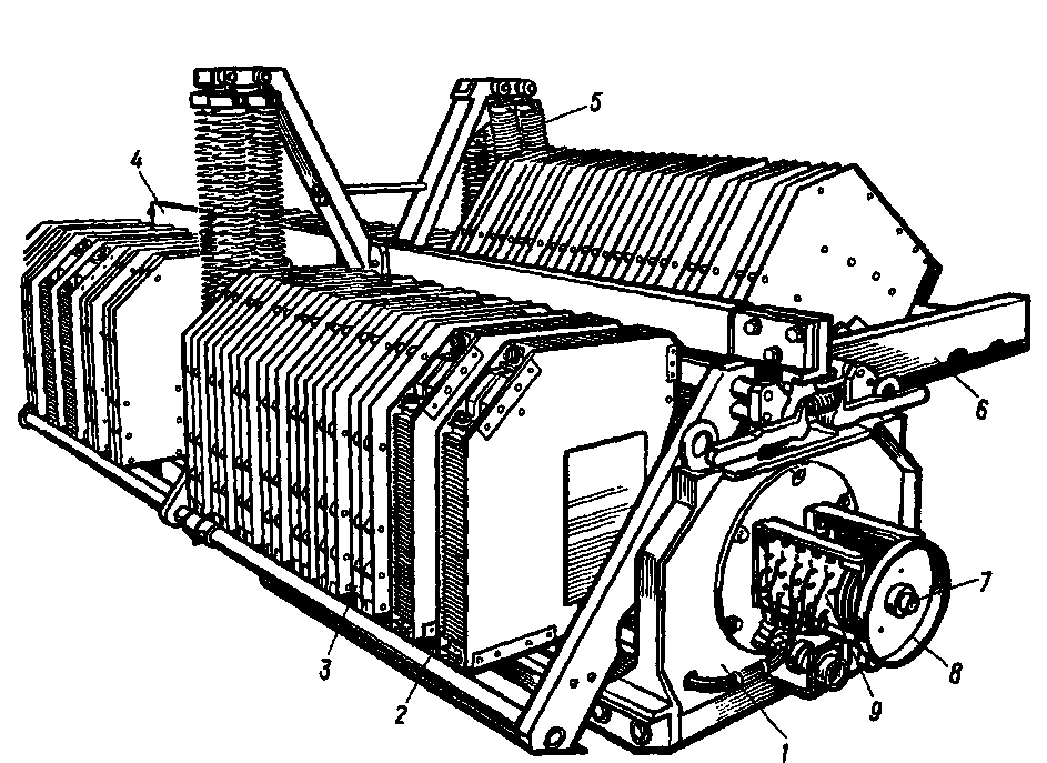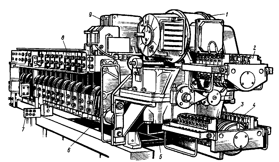 Рис. 179 Главный контроллер ЭКГ-8 электровозов ВЛ60К, ВЛ80С, ВЛ80Т и ВЛ80К. / — электродвигатель, 2 и 3 — кулачковые контакторы блокировочного устройства, 4 — кулачковые шайбы, 5 — механизм с зубчатой передачей, 6—рама, 7— монтажная шина, 8—кулачковый контактор без дугогашения, 9 — кулачковый контактор с дугогашением