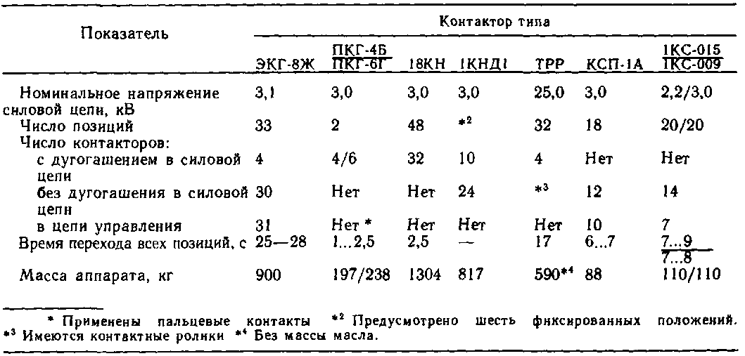 Основные технические данные некоторых многопозиционных групповых контакторов. Технические данные таких контакторов с приводами электродвигательным (ЭКГ-8Ж электровозов ВЛ80\ ВЛ80Т, ВЛ80С, ВЛ60К) и электропневматическим (ПКГ-4Б, ПКГ-6Г электровозов ВЛ8, ВЛ10, ВЛ10у; 18КН, 1КНД1, ТРРТ электровозов соответственно ЧС2, ЧС2Т и ЧС4, ЧС4Т; КСП-1А электропоездов ЭР1 и ЭР2; 1КС-015 с бесконтактным переключателем вентилей, находящийся в блоке с электронным реле, и 1КС-009 с герконовым переключателем вентилей электропоездов соответственно ЭР9М и ЭР2Р, ЭР2Т) приведены в табл. 17.